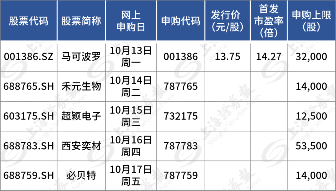 据目前安排,若无变化,10月13日至17日有5只新股可申购,分别为科创板3只、沪深主板各1只。